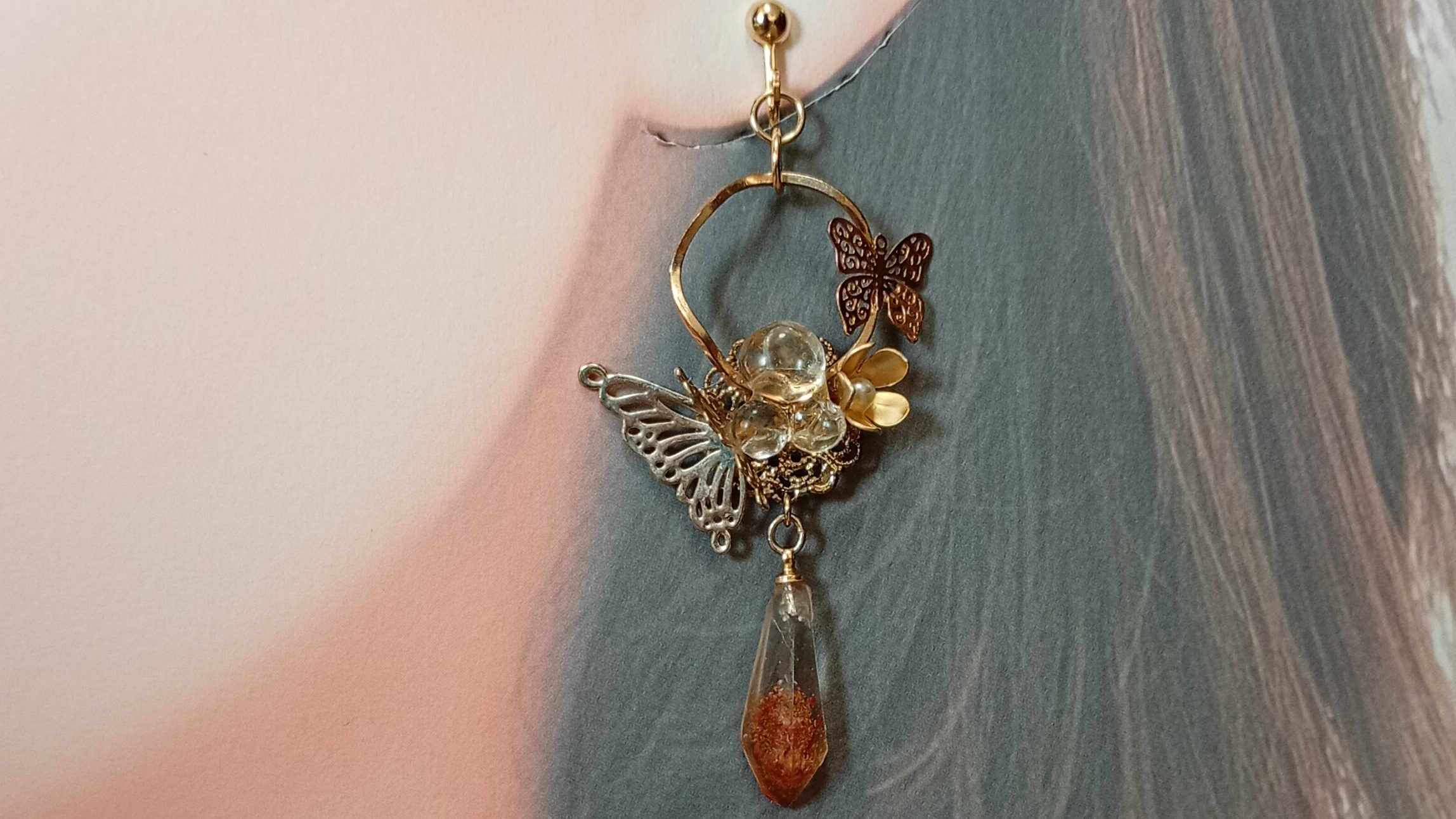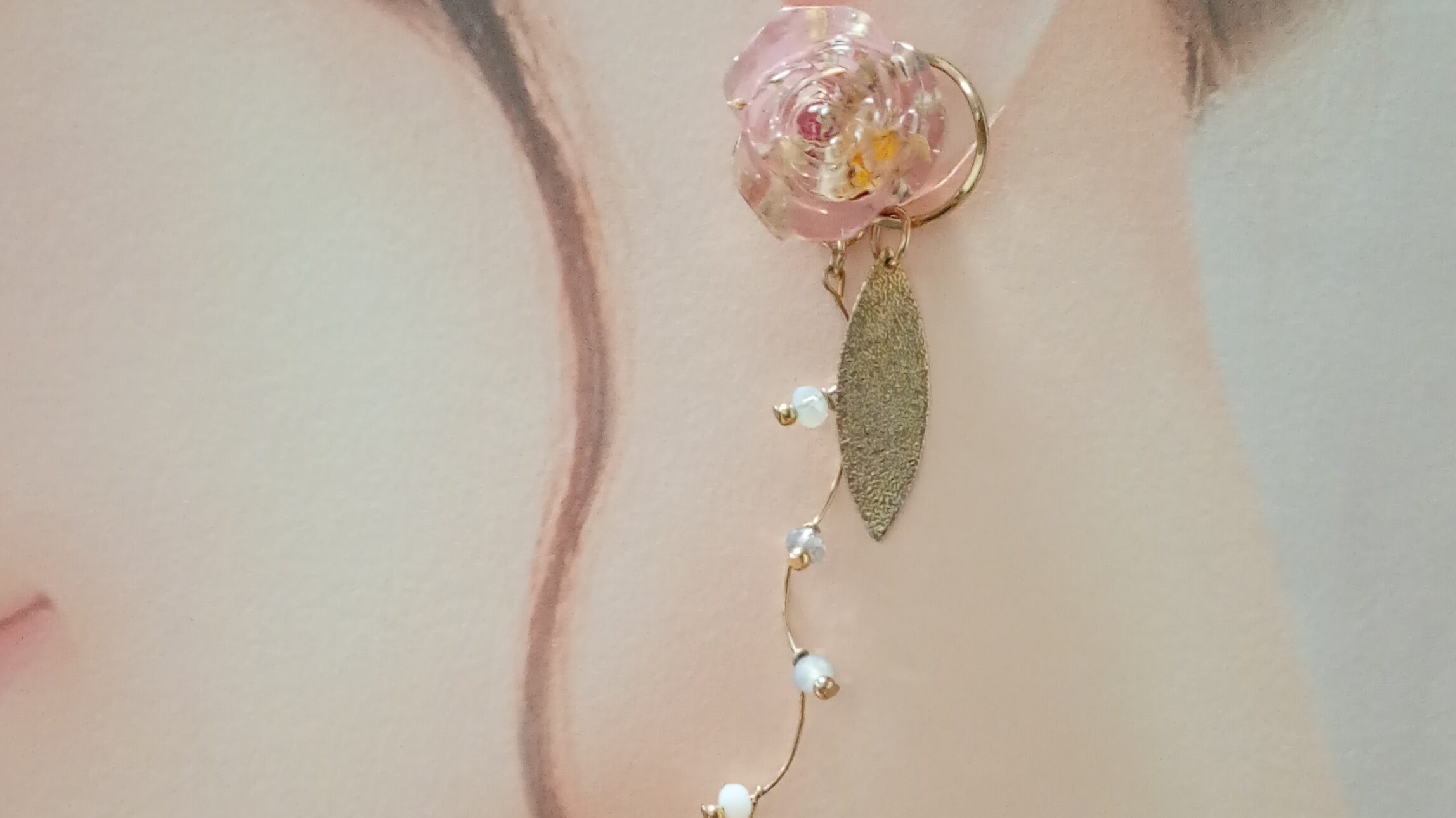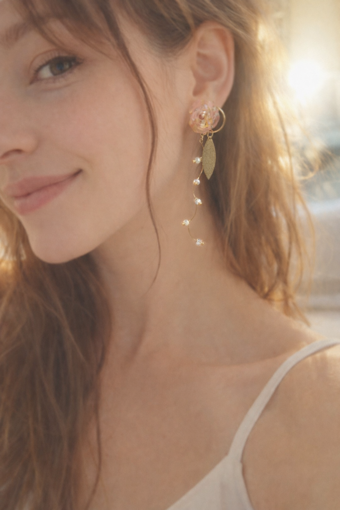 淡く咲く花を閉じ込めた上品なイヤリング。耳元には天然のドライフラワーのチップがやさしく彩りを添え、揺れるたびに繊細な輝きが女性らしさを引き立てます。落ち着きの中に華やぎを感じさせ、日常にも特別な日にも寄り添う一品。大人の余裕と可憐さをさりげなく演出します。