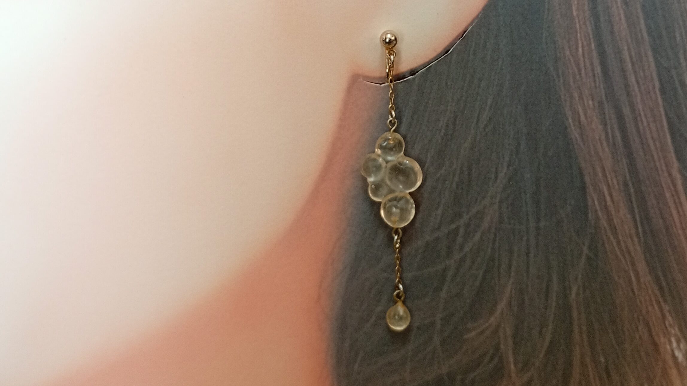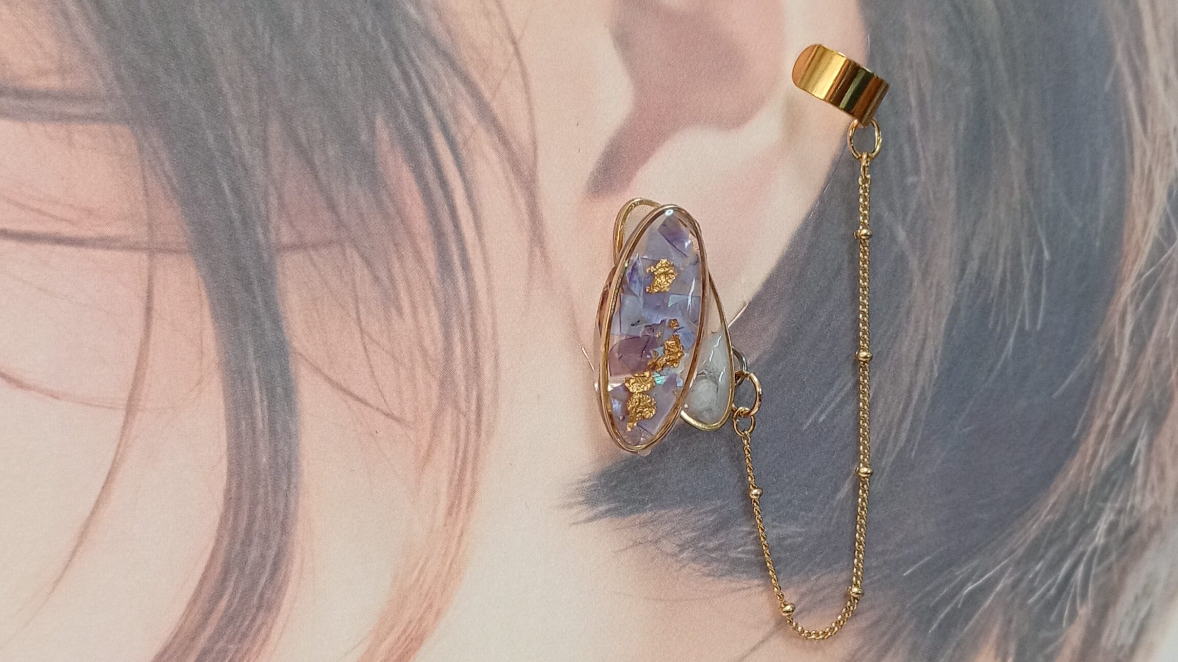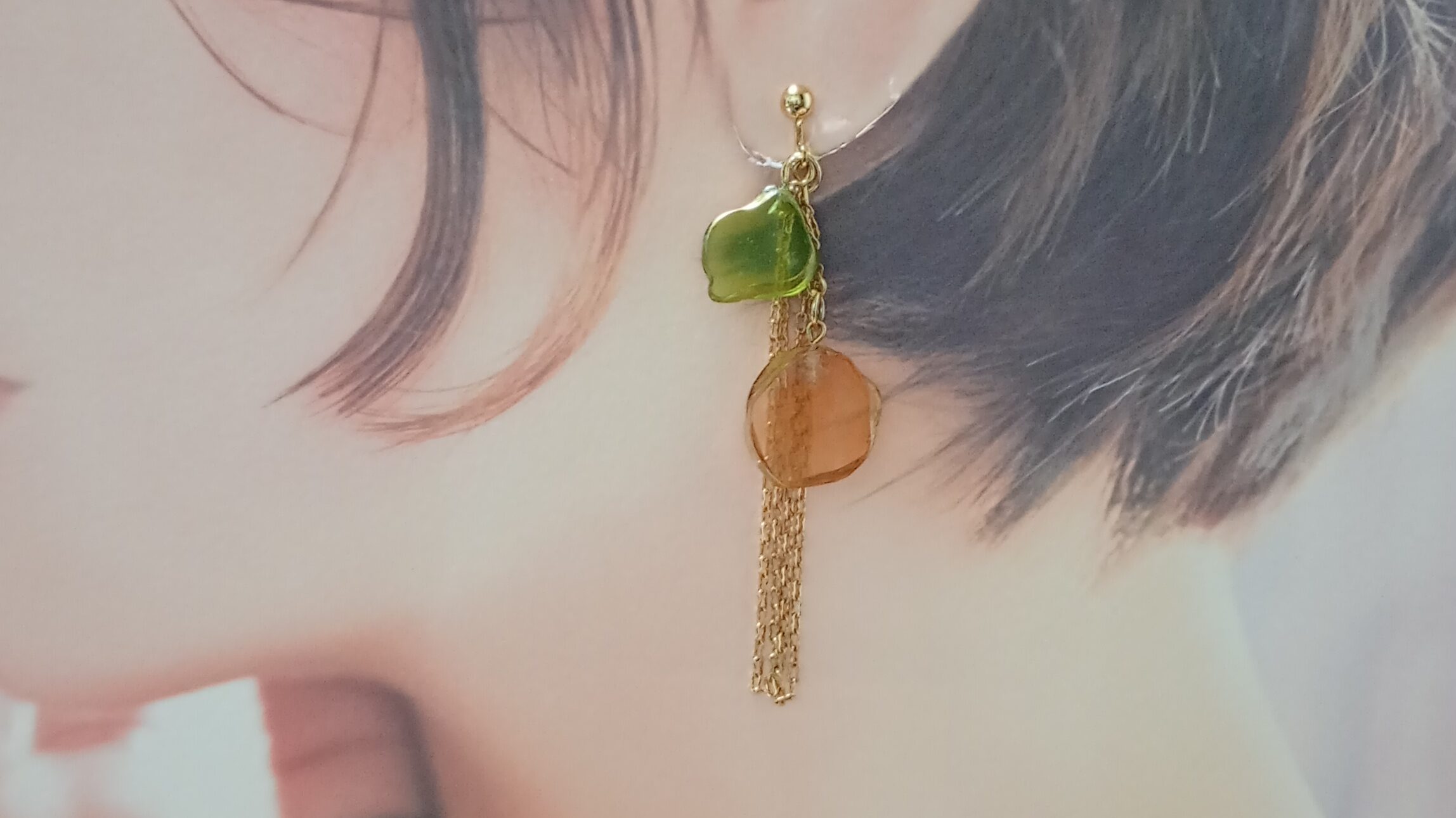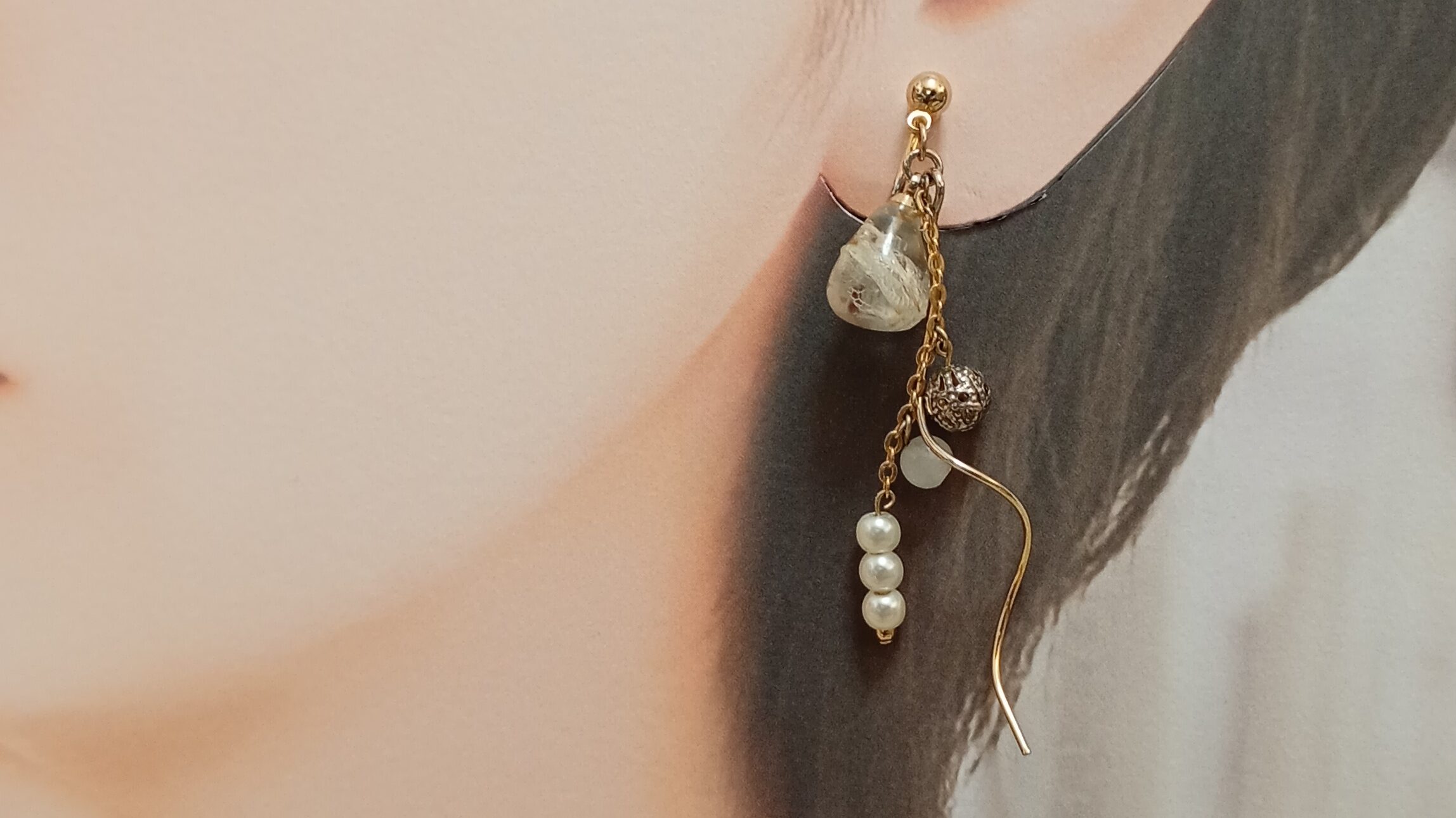 幻想的な色彩と有機的なフォルムが重なり合う、唯一無二のイヤリング。ニュアンスの異なるパーツと繊細なチェーンが、動くたびに奥行きある輝きを描き出します。個性を大切にする大人の女性にふさわしい、洗練と遊び心を兼ね備えたデザイン。シンプルな装いに合わせるだけで、印象的な横顔へと導きます。