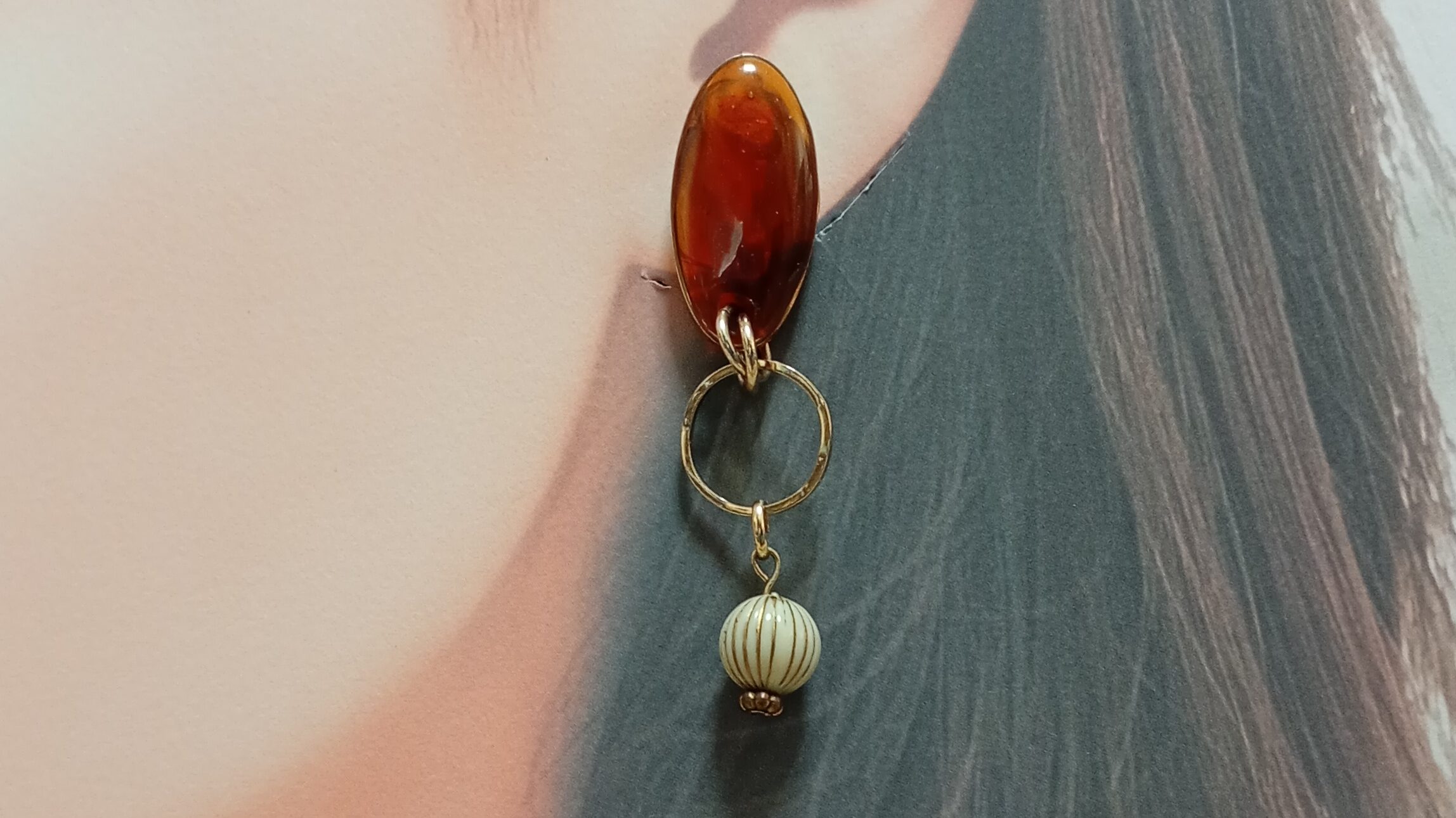 知性を纏う琥珀色の調べ、アンティーク・モダンな耳元へ。艶やかな鼈甲風(べっこうふう)のトップに、繊細なラインのゴールドサークル、そしてストライプ柄のビーズを添えて。異なるテクスチャーを絶妙なバランスで組み合わせ、どこかクラシックでありながら現代的な軽やかさを表現しました。深みのあるブラウンはお肌を美しく引き立て、横顔に知的な奥行きを与えます。シックな装いにも、カジュアルなデニムスタイルにも。時を超えて愛されるデザインが、あなたの日常をそっと格上げします