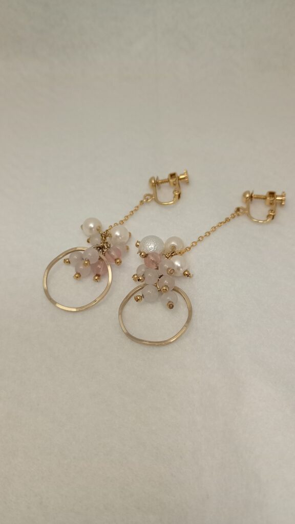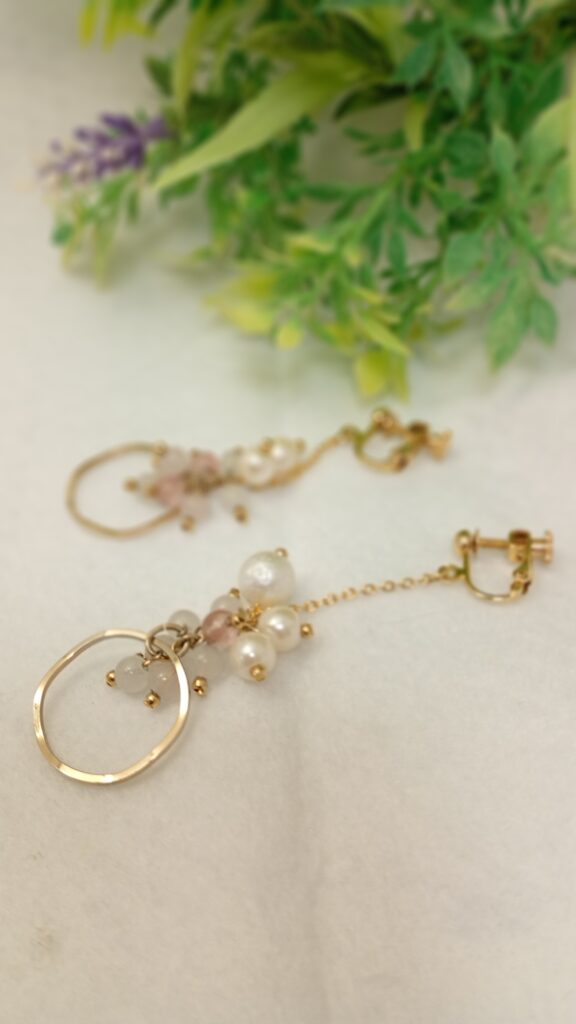 上品な輝きを放つコットンパールと天然石のビーズを、ブドウの房のように丁寧に連ねたイヤリング。揺れるたびに軽やかな動きが生まれ、横顔にやさしい華やぎを添えます。繊細さと存在感を兼ね備えたデザインは、日常使いから特別なシーンまで幅広く活躍。大人の女性にふさわしい、品格ある可愛らしさを演出します。